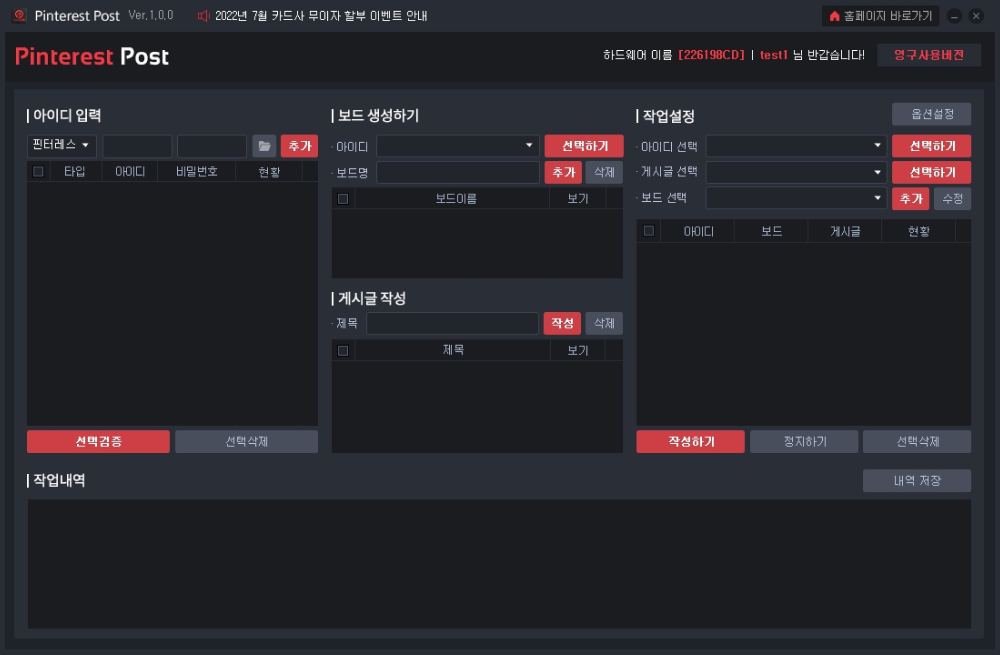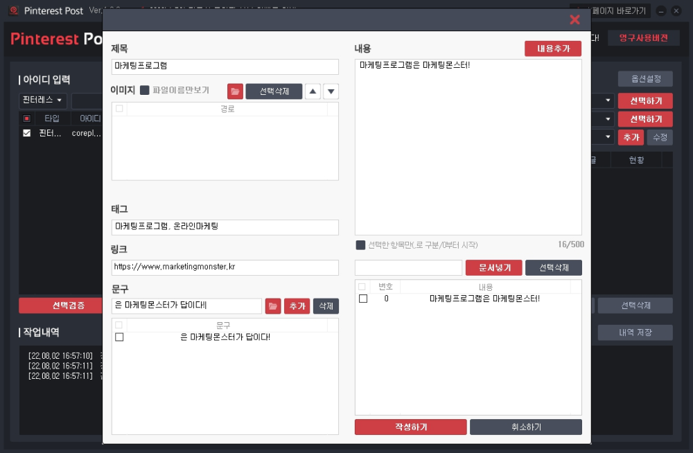 등록을 원하는 이미지와 글을 자동으로 해당 게시물에 업로드 해줘서 너무 편하게 사용하고 있습니다. 프로그램 하나로 보드생성과 등록까지 한번에?